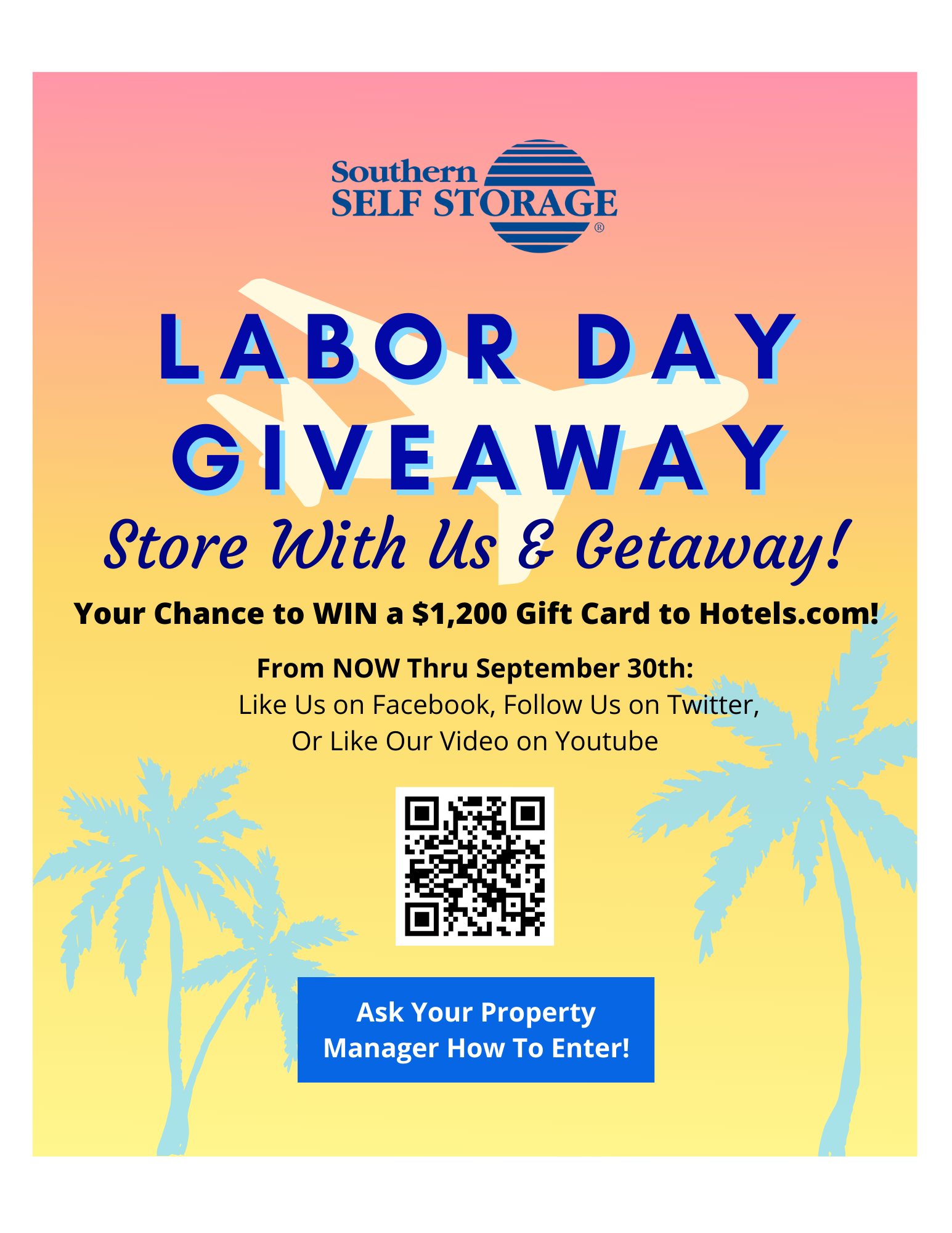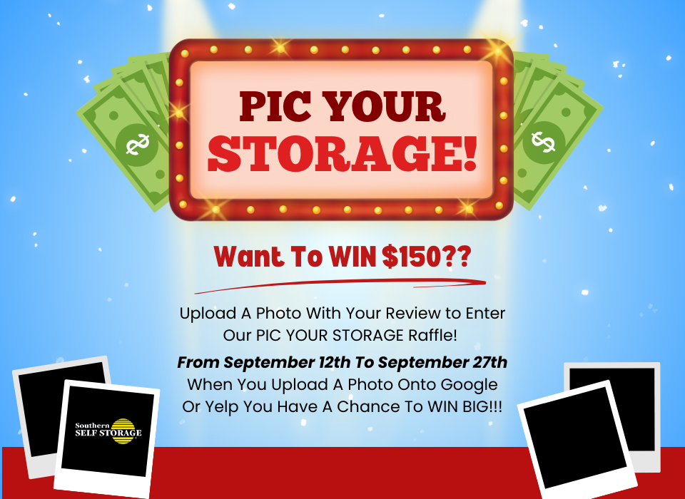 The Pic Your Storage Raffle had our customers enter with, you guessed it, a pic! Tenants, old and new, could enter by taking a photo of Southern Self Storage. It can be a photo of a sign, the merchandise area, the leasing office, the outside of the building, or it could also be their storage units but it did not have to be. Customers can upload it onto Google or Yelp, though Google was encouraged through the custom QR codes on each store’s personalized flyers.