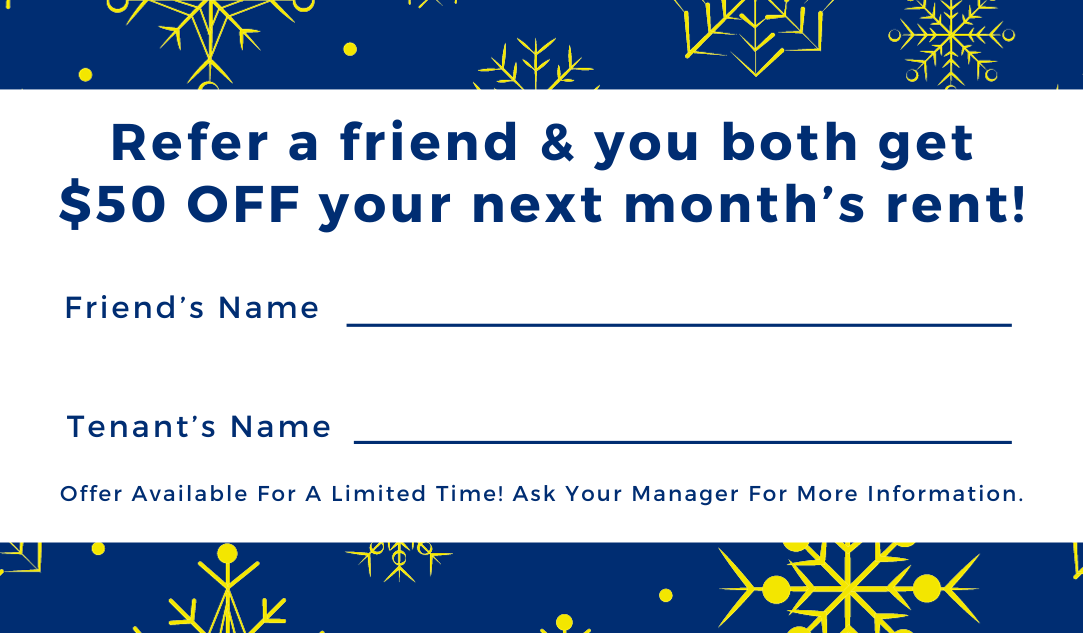 During the season of giving, we allowed our tenants to share a special referral discount with their friends and families. I made seasonal referral cards in both English and Spanish and we promoted the holiday campaign.
